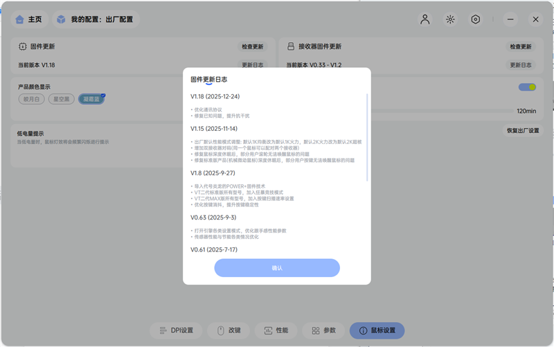 在右下角的鼠标设置界面,就可以看到当前的固件版本以及更新按钮。我们点开更新日志,可以看到这款鼠标在9月27日的V1.8版本中,就导入了代号\"炎龙\"的POWER+固件技术,还为VT0标准版引入了狂暴竞技模式。